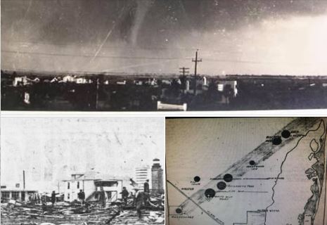 Shortly after noon golfers at the Hialeah Golf Course (now called Miami Springs Country Club) were the first to spot the funnel cloud coming out of the Everglades. The tornado leapfrogged over the golf course & Hialeah taking the roof off of one of the barns at the Miami Jockey Club(now Hialeah Race Track) & then decimating the White Belt Dairy Farm. The funnel remained churning for almost an hour killing 5 people. This rare photo of the tornado was taken by a salesman atop a tower in Hialeah. The map shows the path of the tornado.
