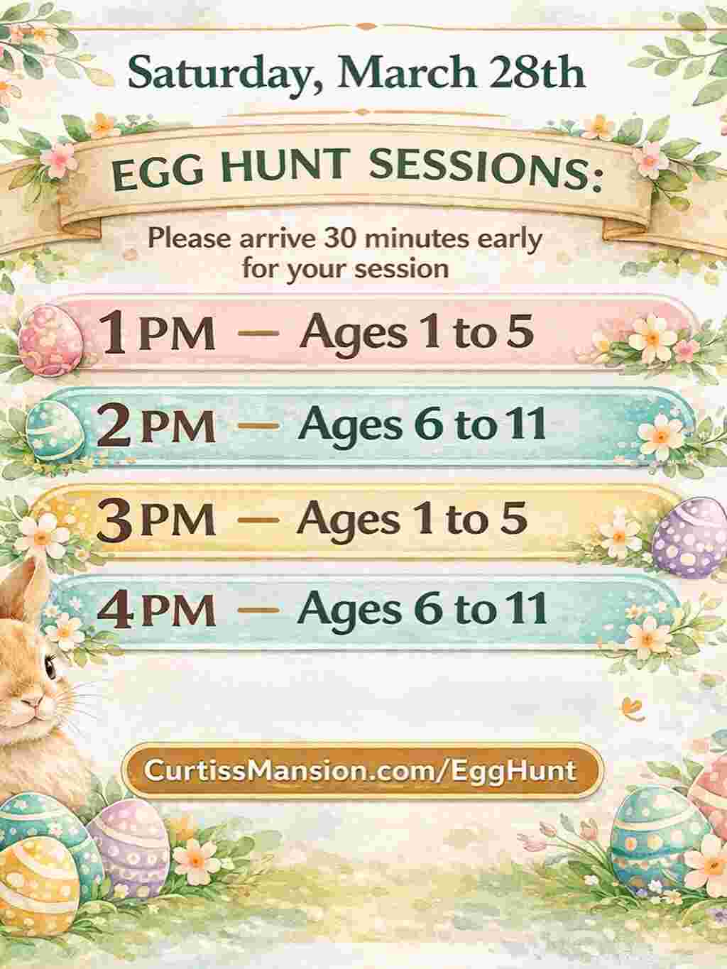 Curtiss Mansion’s Awesome Egg Hunt takes place on March 28, 2026 with the first egg hunt beginning at 1:00 PM at Curtiss Mansion in Miami Springs. Guests are encouraged to arrive 30 minutes early and can enjoy age-specific egg hunts, photos with the Easter Bunny, and family-friendly activities.