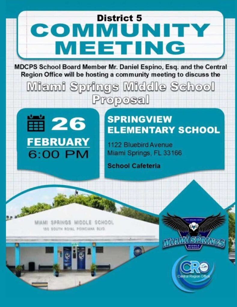 There will be a Community Meeting to discuss the future of Miami Springs Middle School. The meeting will not be held at Miami Springs Middle School. It will not be … Continue reading Community Meeting Re: Miami Springs Middle School / High School Merger
