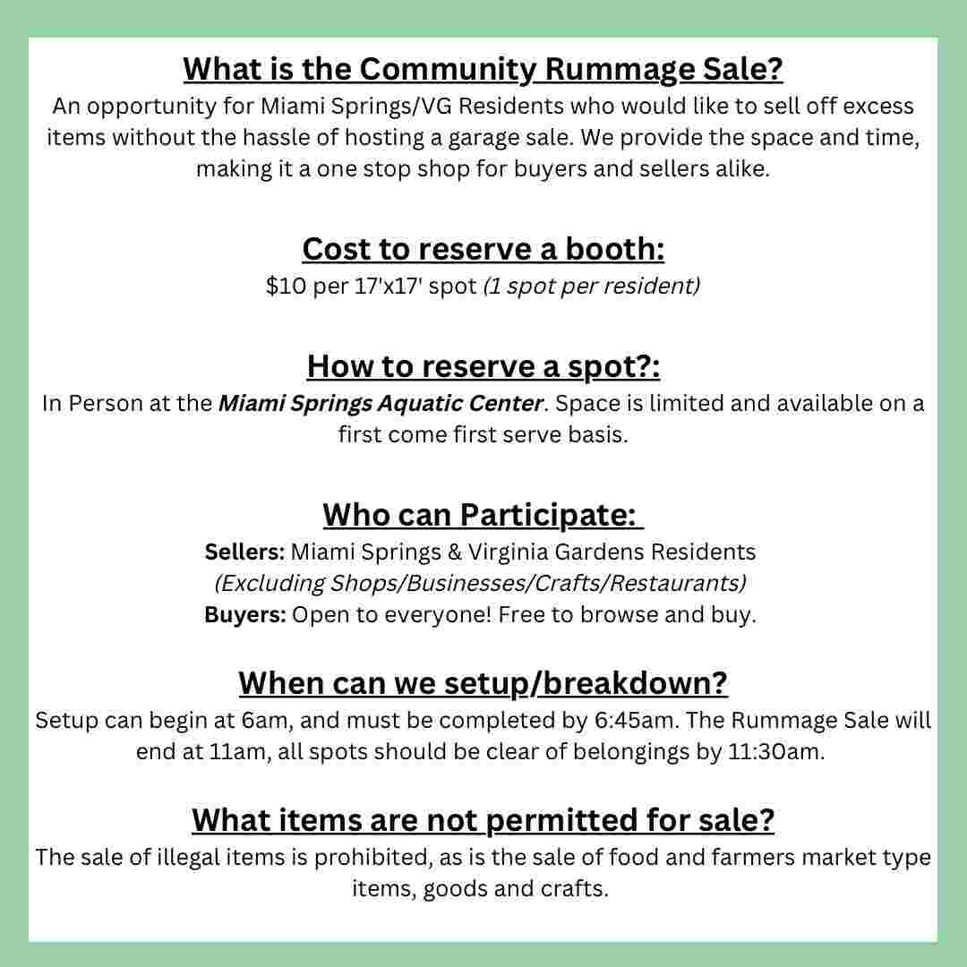 The Community Spring Rummage Sale takes place on April 25 at 7:00 AM at the Miami Springs Aquatic Center Parking Lot located at 1401 Westward Dr., offering a morning of community shopping and great finds.