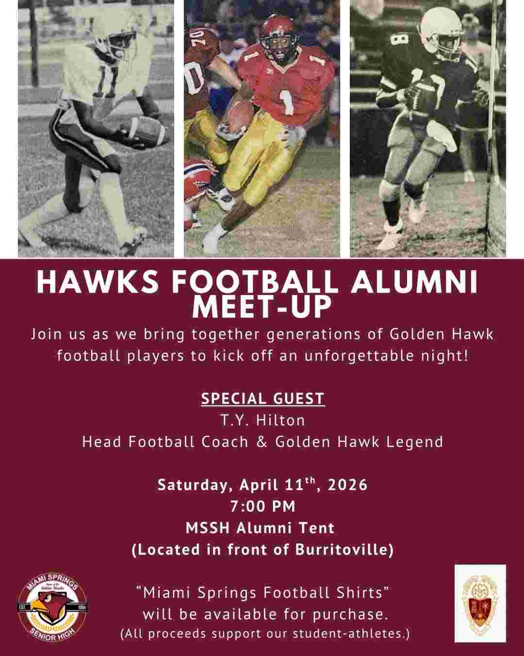 The Hawks Football Alumni Meet-Up featuring T.Y. Hilton takes place on April 11, 2026 at 7:00 PM at the MSSH Alumni Tent located in front of Burritoville, bringing together generations of Golden Hawk football players for a special night of celebration and connection.