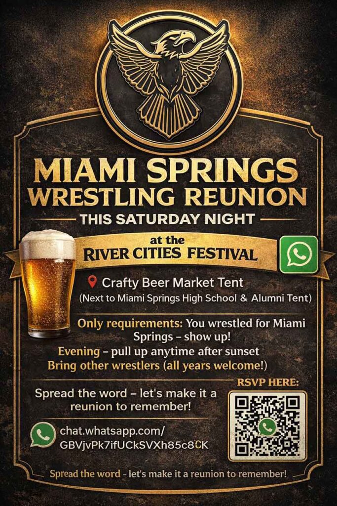 Miami Springs Wrestling Family — We’re putting together a Wrestling Reunion this Saturday night during River Cities Festival. Location: Crafty Beer Market Tent (next to Miami Springs High School & … Continue reading Miami Springs Wrestling Reunion