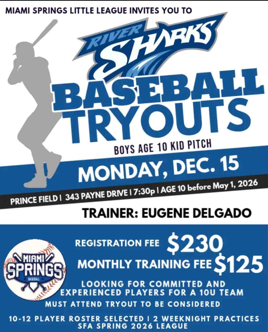 Miami Springs Little League is inviting young athletes to try out for the River Sharks 10U Kid Pitch team. Boys who will be age 10 before May 1, 2026 are eligible to participate.