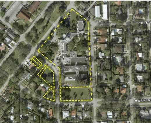 The Miami Springs City Planner delivered the following proposal to the City Council regarding the former Fair Havens property aka the old Country Club Hotel. The proposal includes a change in land use of two parcels shown below in yellow from single family residential to medical residential.