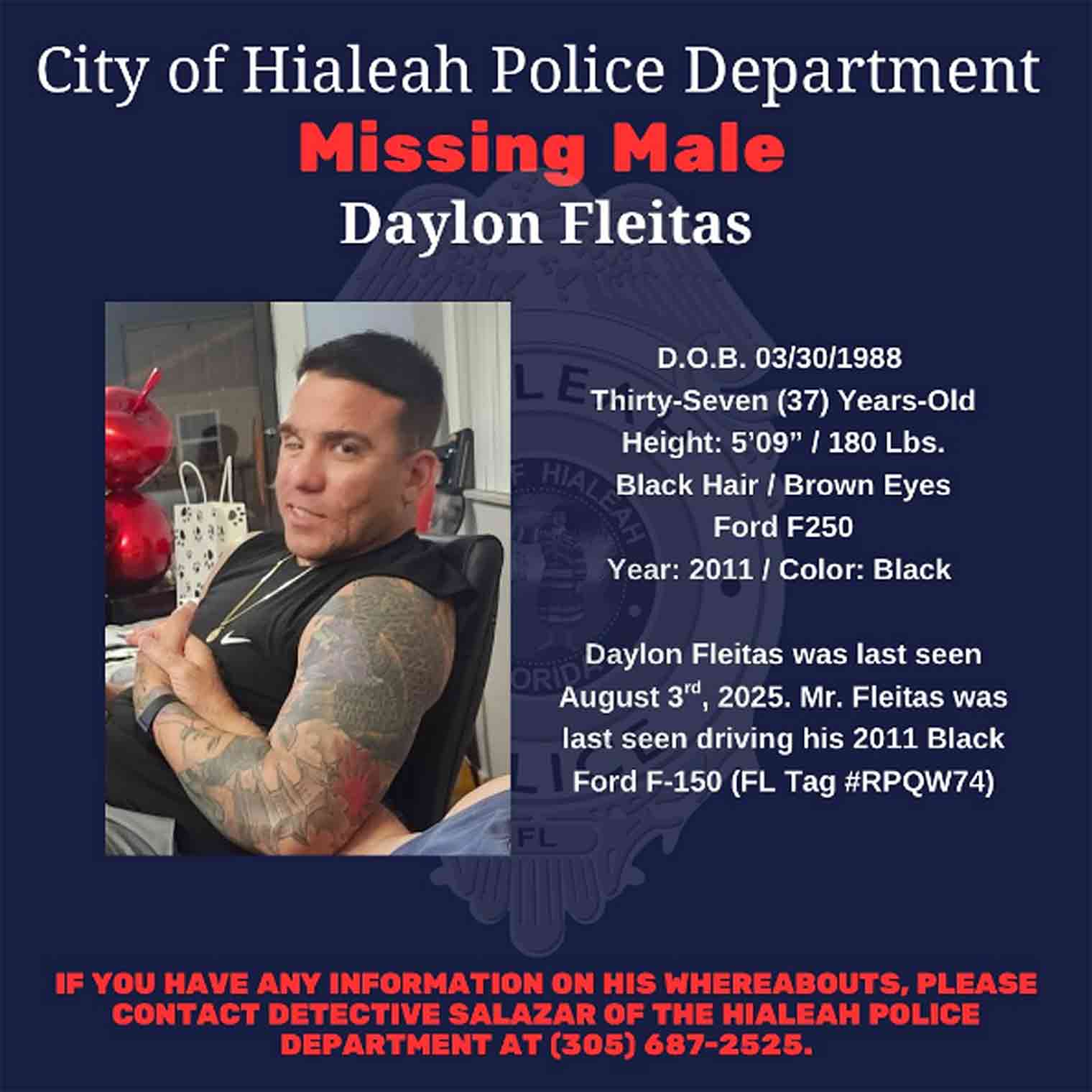 The City of Hialeah Police Department is asking for the public’s help in locating Daylon Fleitas, 37, who has been missing since August 3, 2025. He was last seen driving a black 2011 Ford F-150 with Florida license plate RPQW74.