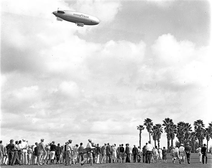 The Goodyear Blimp Defender flying over Miami Springs Country Club crowds attending the 6th Annual Miami Open Jan 4, 1930. The tournament was won by legendary golfer Gene Sarazen. The following week the Defender was joined by her smaller sister ships Vigilant and Puritan at the Miami All American Air Meet.