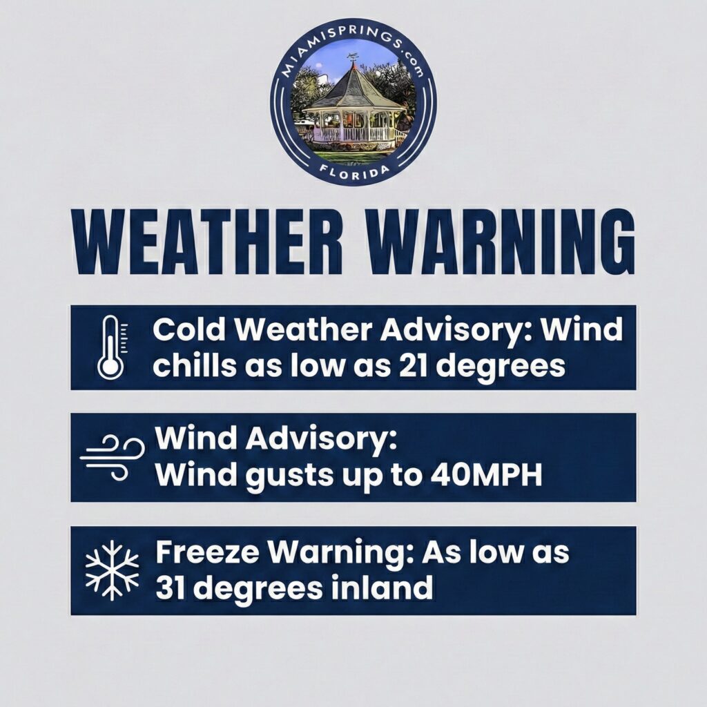 Freeze Warning: Sub-freezing temperatures as low as 31 expected, although more likely further inland than in Miami Springs / Virginia Gardens.