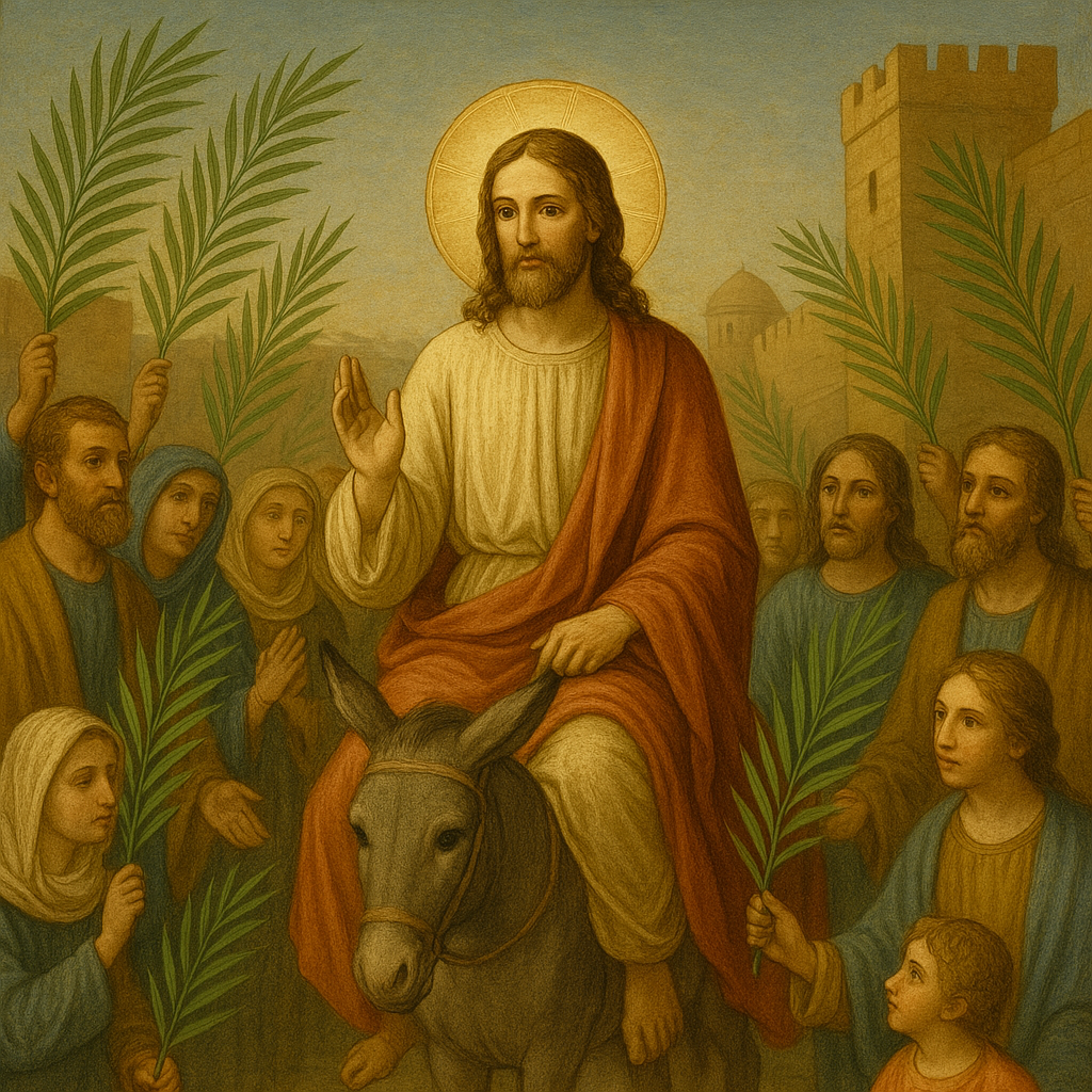 Palm Sunday commemorates Jesus Christ’s triumphant entry into Jerusalem, an event described in all four Gospels (Matthew 21, Mark 11, Luke 19, and John 12). Riding humbly on a donkey, Jesus was welcomed by crowds waving palm branches and shouting, “Hosanna! Blessed is he who comes in the name of the Lord!” (Matthew 21:9).