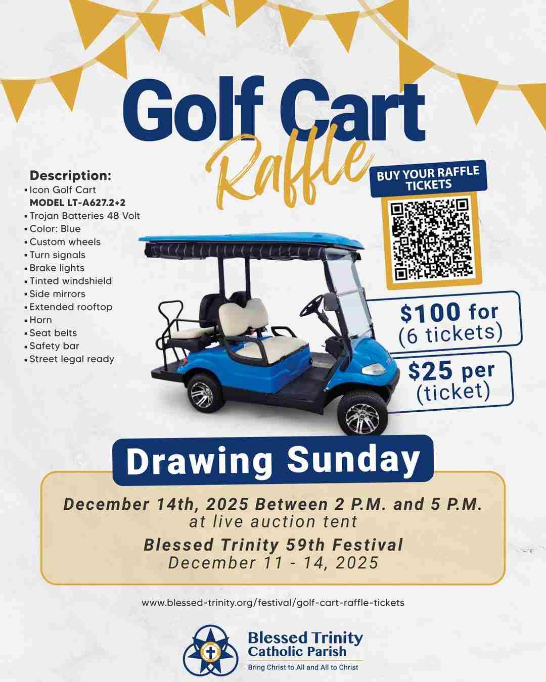 Take a shot at bringing home a blue, street-legal Icon Golf Cart Model LT-A627.2+2 at this year’s Blessed Trinity 59th Festival. Raffle tickets are just $25 each or 6 for $100, and the drawing will be held Sunday, December 14th, 2025 (2–5 PM).