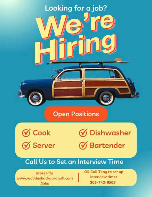 Woody’s Backyard Grill is now hiring for various positions including:
